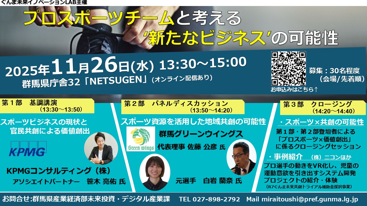 他県におけるスポーツを活用した地域創生・ビジネス創出の事例紹介や、プロスポーツチーム(群馬グリーンウイングス)からの地域や企業に求めるニーズ紹介により、登壇者と参加者、参加者同士の連携による地域活性化・ビジネス創出を目指します!