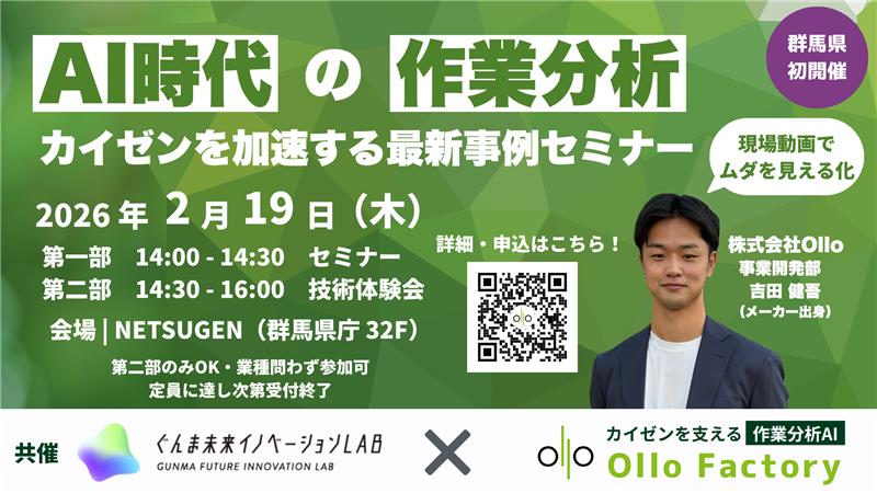 ぐんま未来イノベーションLABは、LAB会員である株式会社Olloと共催で、製造現場の作業効率化や安全性の向上、AI活用の推進を目指し、標記セミナーを開催します。